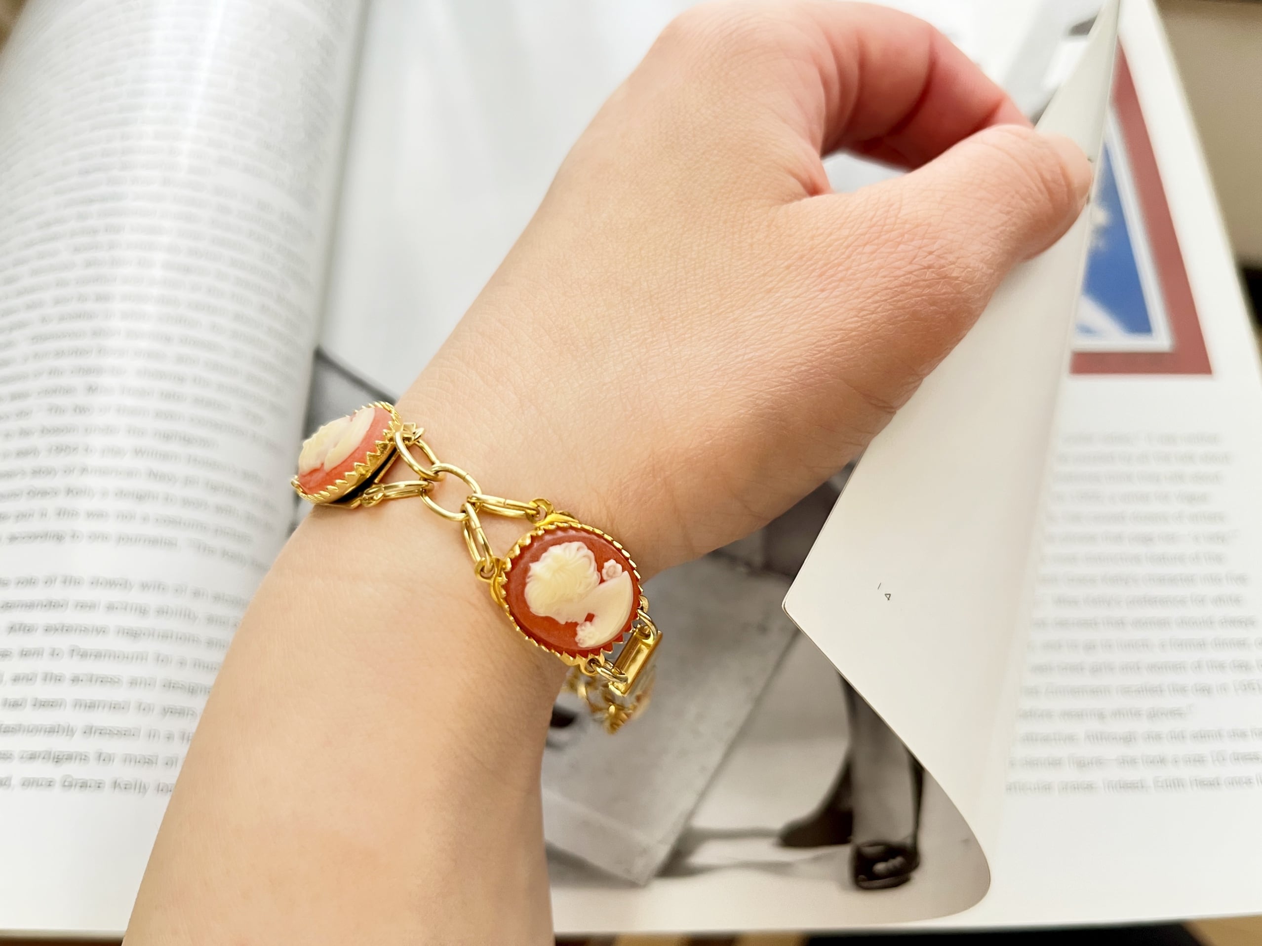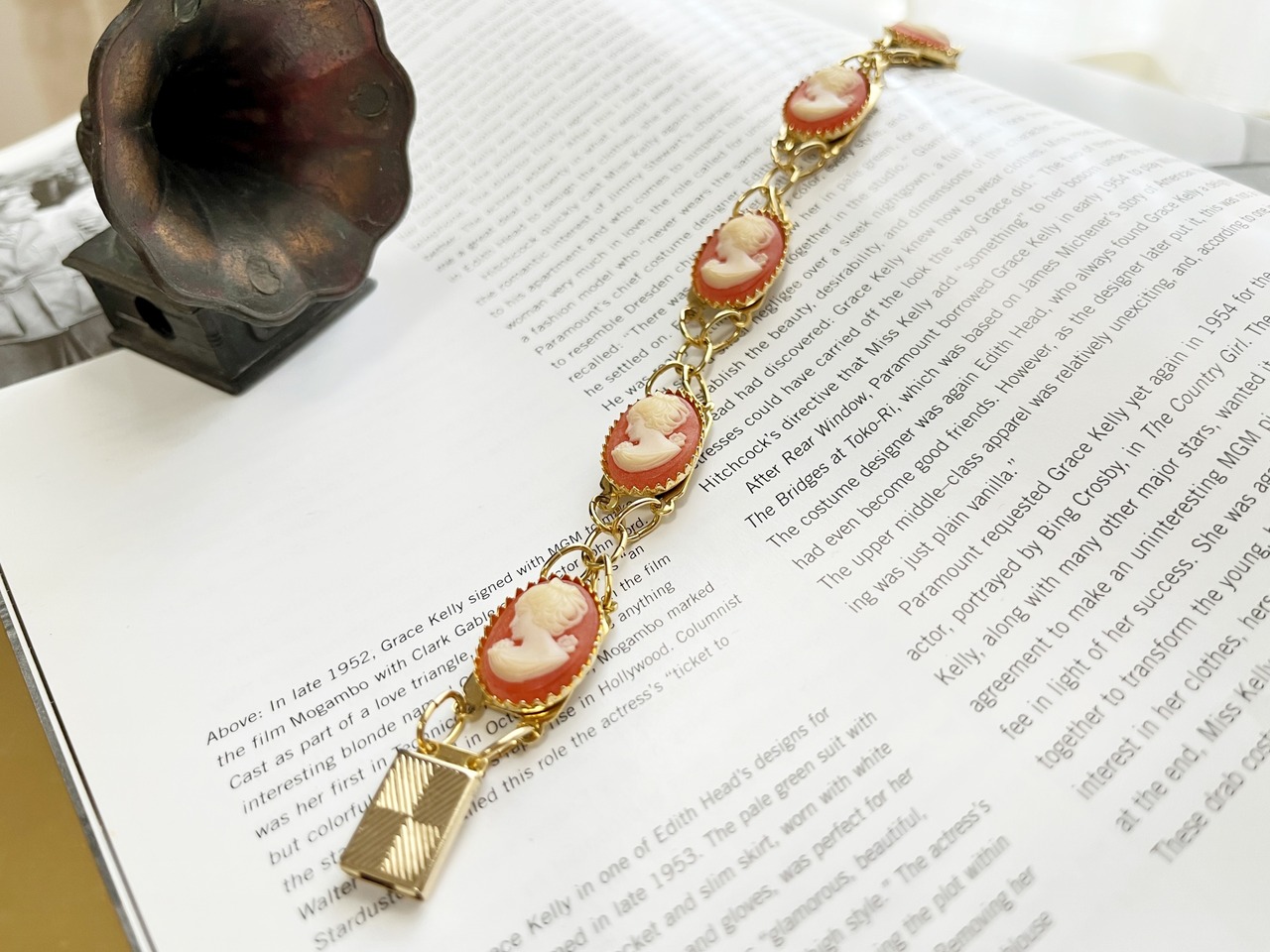 アンティークな雰囲気のカメオ風デザインで、華やかな装いにピッタリのコスチュームジュエリーのブレスレットです。